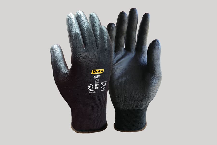 Guante tejido de Poliéster GALGA 13 negro con revestimiento en palma y punta de dedos en PU (poliuretano) negro.